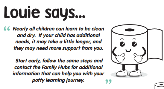 Remember that help is available with potty learning in the Family Hubs, including how to potty learning when children have additional needs.