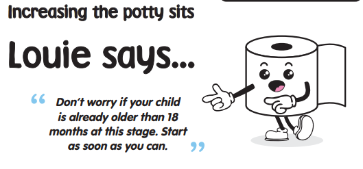 In step 1, Louie Says to start early with baby as soon as they can sit safely. It is not recommended that you sit a baby on the toilet however, so this advice changes if you decide you don’t want to use a potty.
